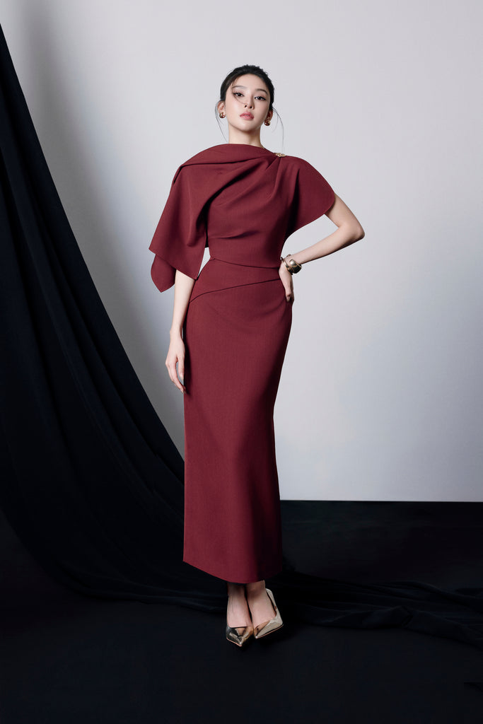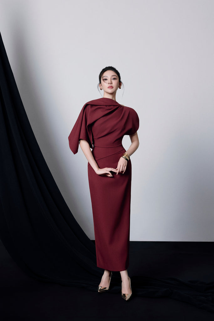 The Agnes Midi Dress showcases refined structure through a clean, straight-cut silhouette elevated by modern detailing. Featuring asymmetrical pleating and a diagonal seam that artfully divides the skirt, this design creates visual interest while maintaining timeless sophistication. The structured upper bodice offers a polished finish, while a delicate teardrop zipper at the back completes the look with understated elegance.