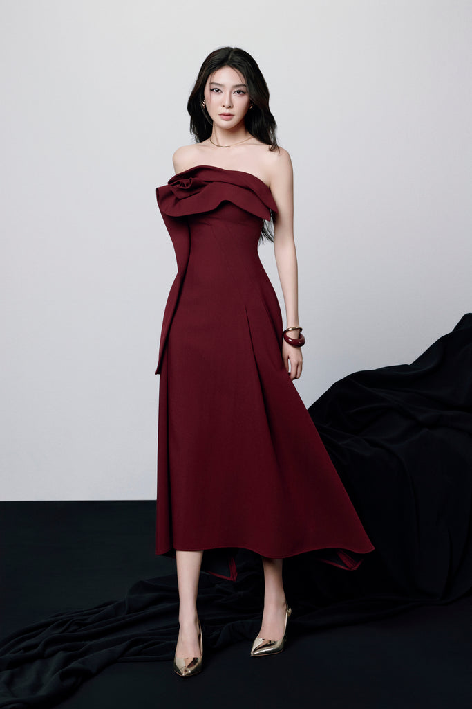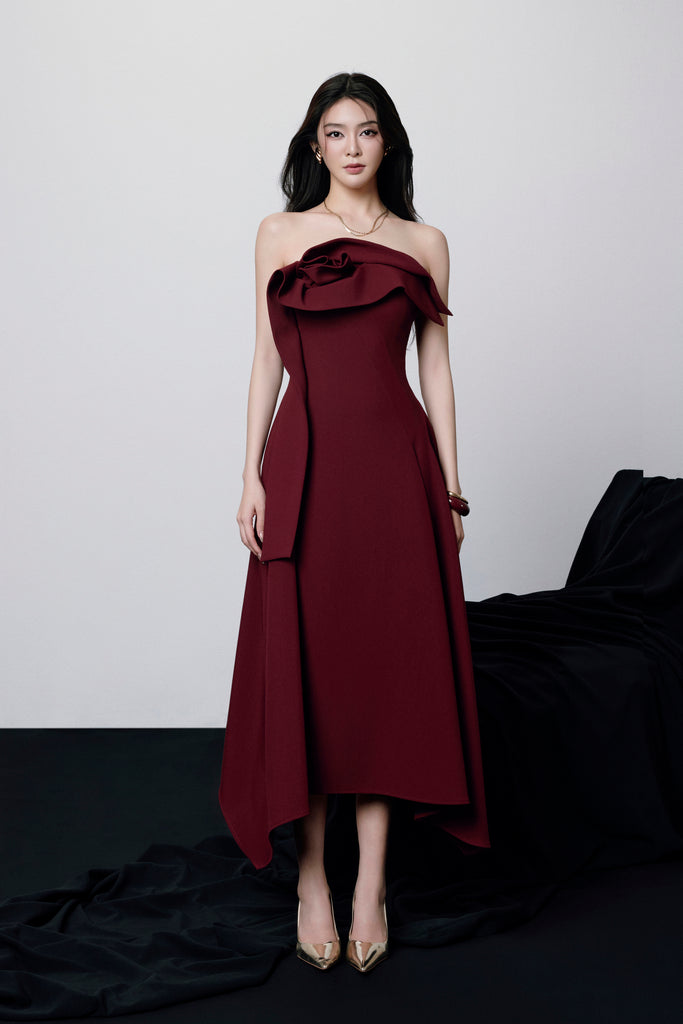 The Lenora Dress captures timeless femininity through a sculpted strapless silhouette and intricate draping artistry. Designed with a fitted waist that flows into an elegant A-line midi skirt, the dress features softly twisted, layered fabric at the bust, forming a delicate floral motif that draws the eye. Curved pleats extend diagonally from the hip to the bodice, enhancing volume and movement while creating a refined, architectural shape. Finished with a discreet teardrop zipper at the back, the Lenora Dress is both romantic and impeccably structured.